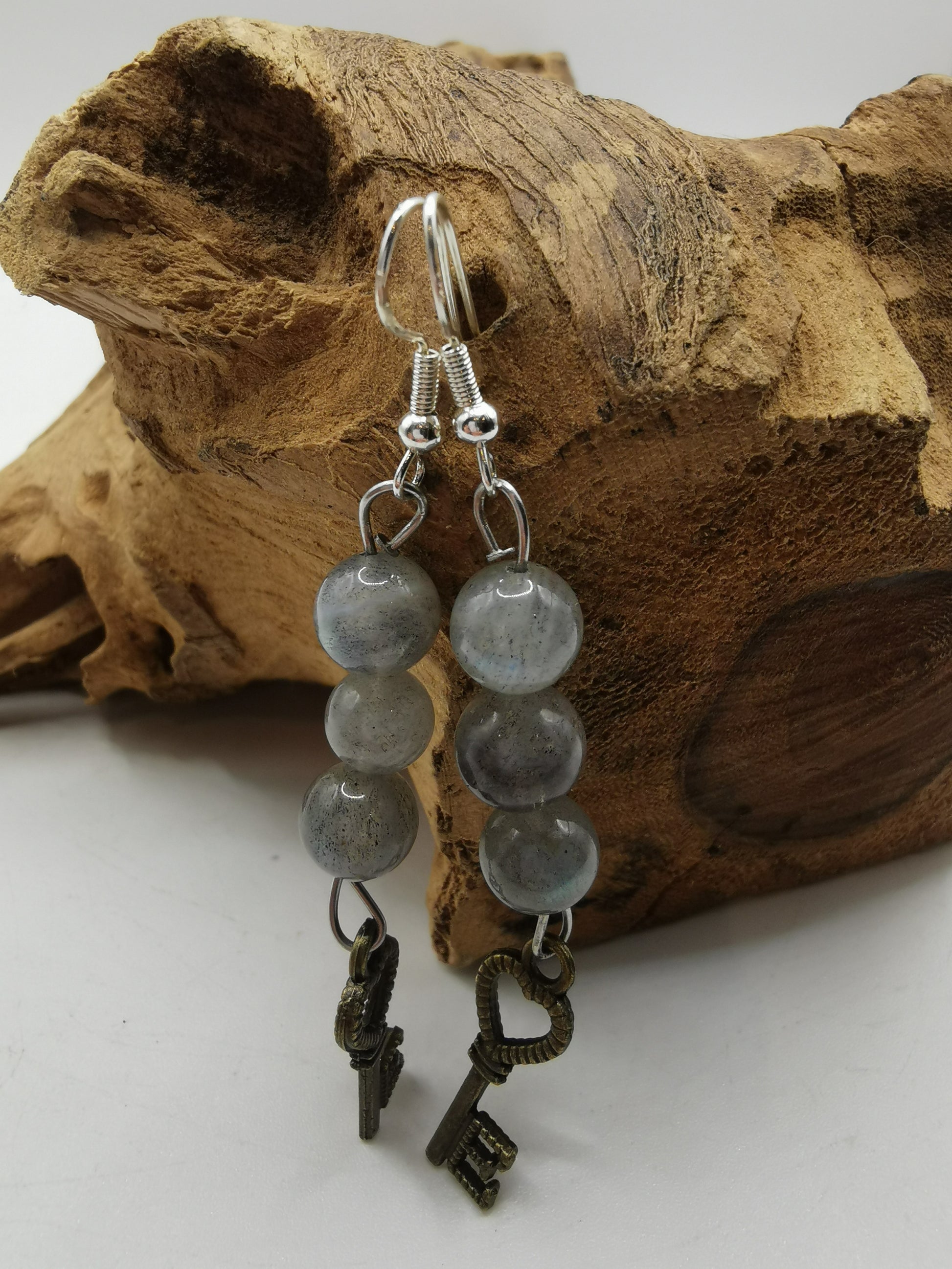 Each earring features three 8mm Labradorite beads, known for their mesmerising flashes of blue, green, and gold that appear as the light moves. Paired with intricate steampunk-style embellishments, this design brings together mystery, transformation, and industrial elegance in a truly unique statement piece.